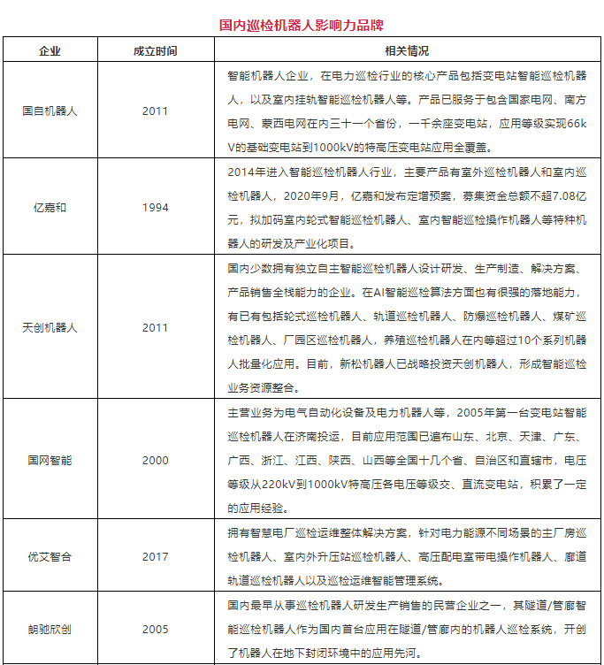 市場空間的廣闊吸引了更多的入局者,近年來,越來越多的機(jī)器人制造廠商投入到變電站巡檢機(jī)器人的設(shè)計(jì)、研發(fā)和銷售,據(jù)統(tǒng)計(jì),目前國內(nèi)已有25家左右具有一定規(guī)模的巡檢機(jī)器人制造廠商,并已研制出適應(yīng)于不同環(huán)境條件的巡檢機(jī)器人。以下盤點(diǎn)了當(dāng)前國內(nèi)巡檢機(jī)器人市場一些影響力品牌,供大家參考!